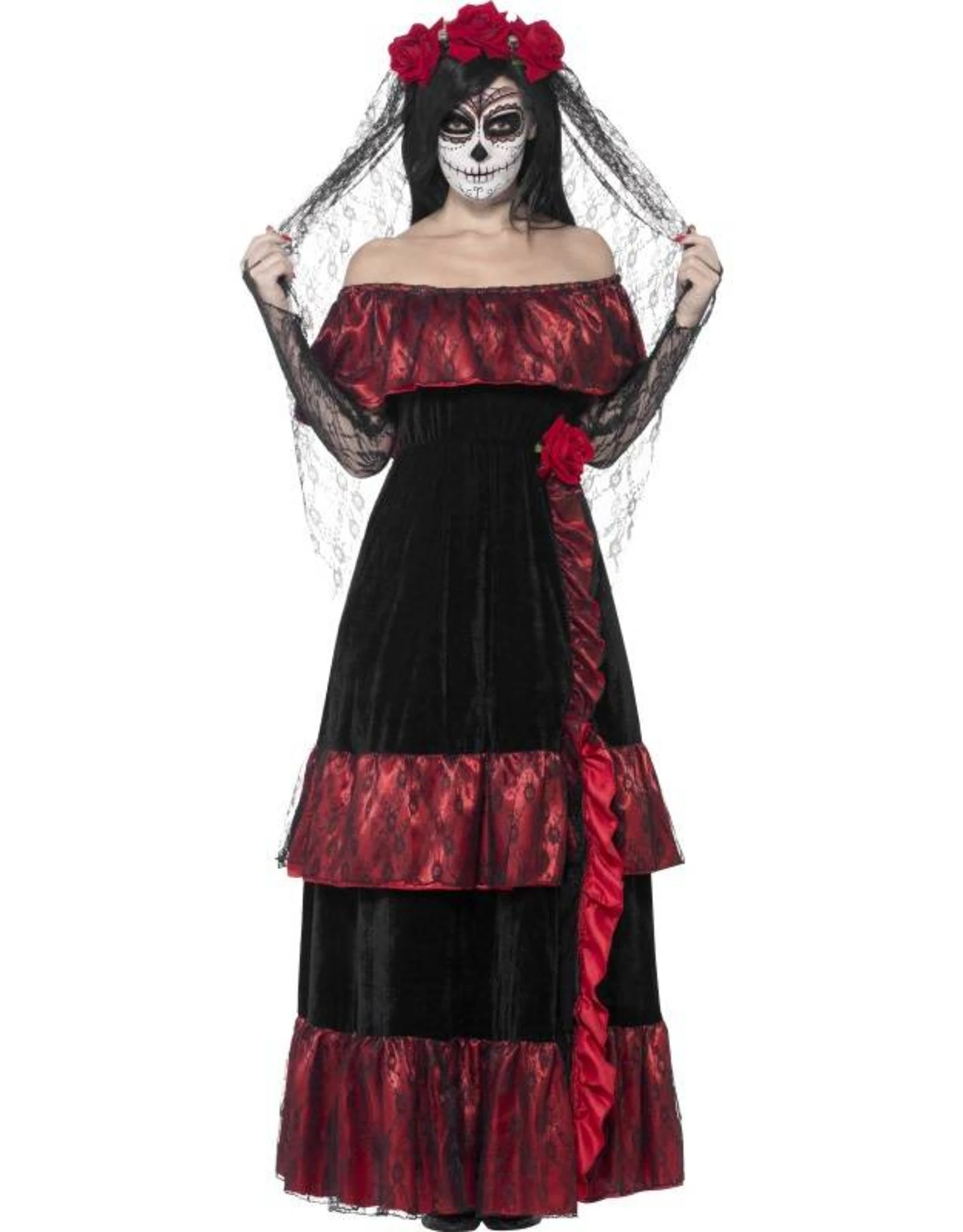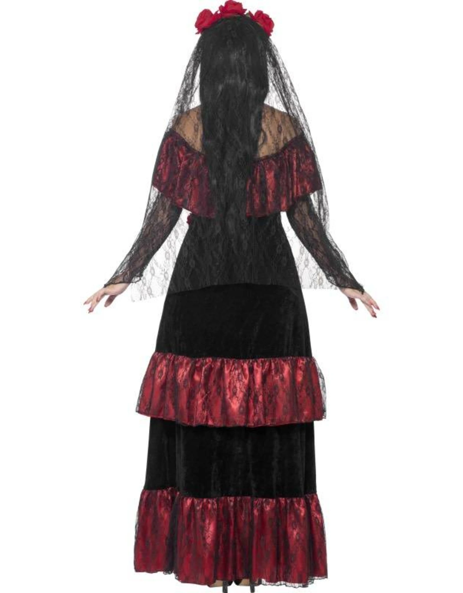 Dit kostuum bestaat uit een jurk en sluier met rode rozen.