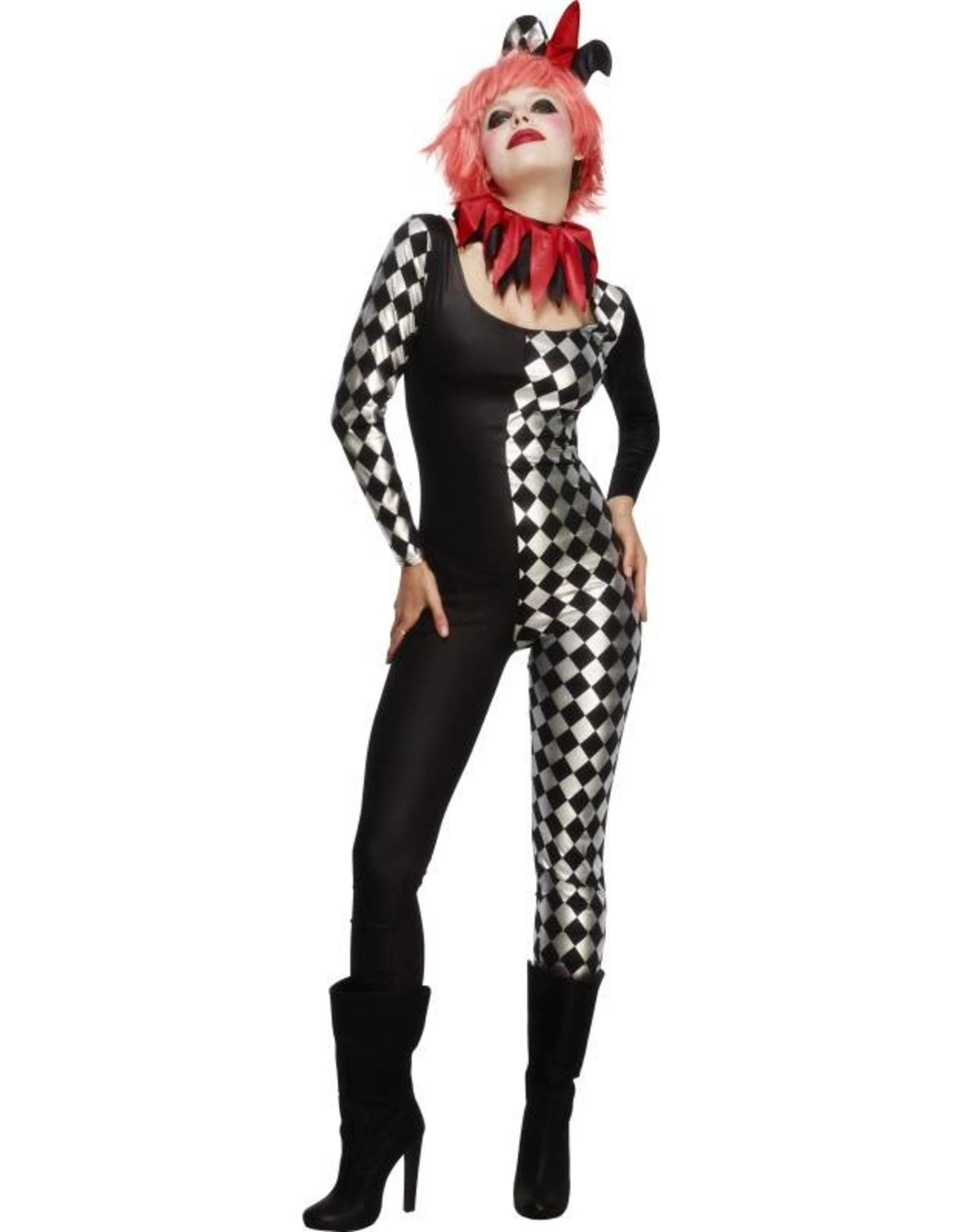 Dit kostuum bestaat uit een jumpsuit met een kraag en hoedje op diadeem.