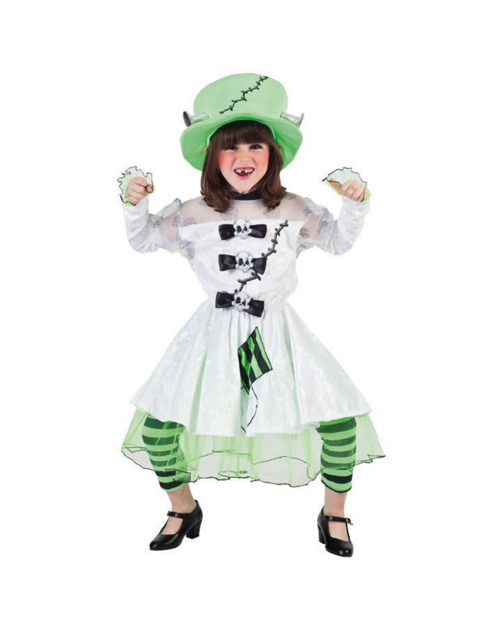 Dit kostuum bestaat uit een jurk, broek en hoed.
