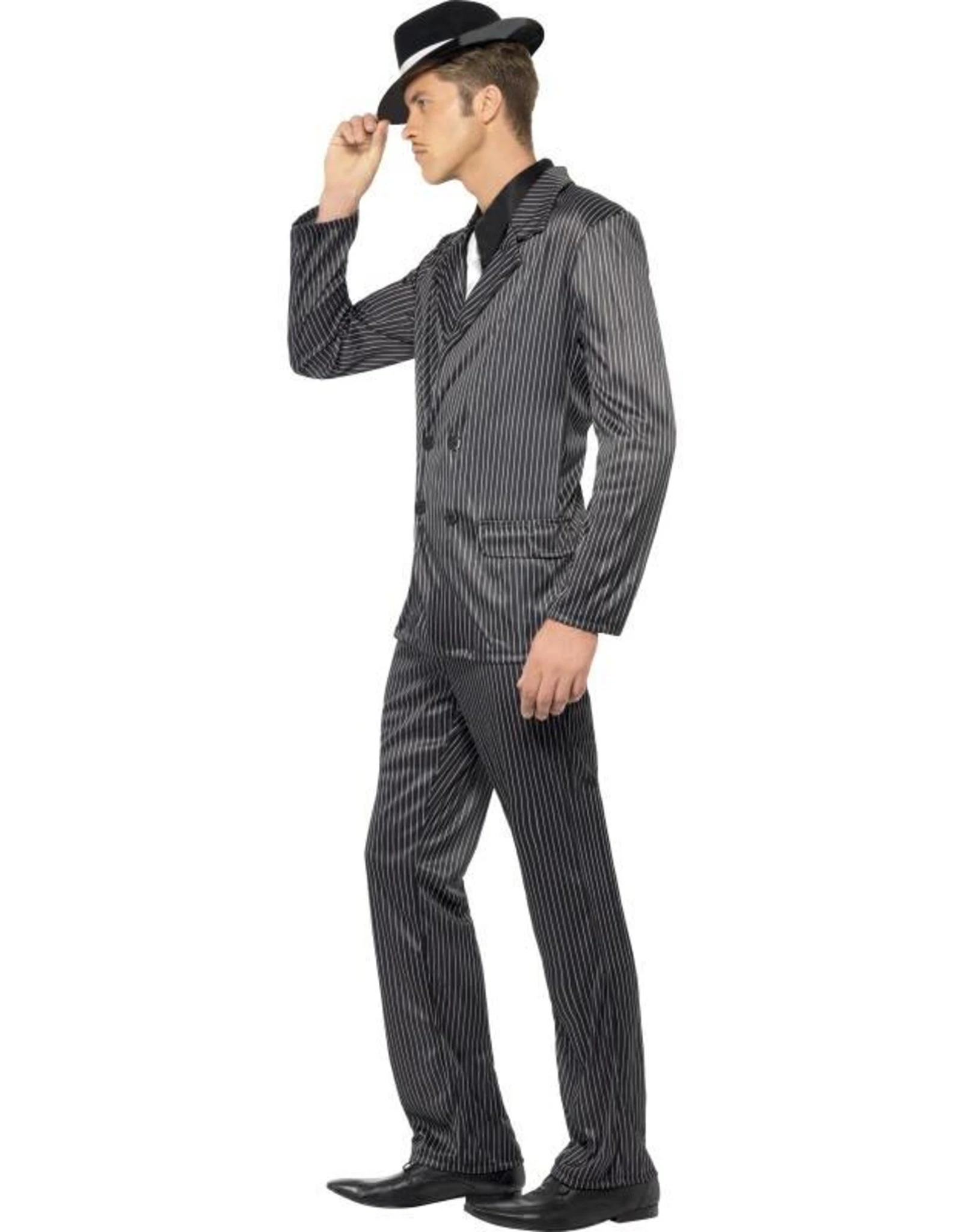 Dit kostuum bestaat uit een gestreepte jas en broek, Shirt met stropdas.