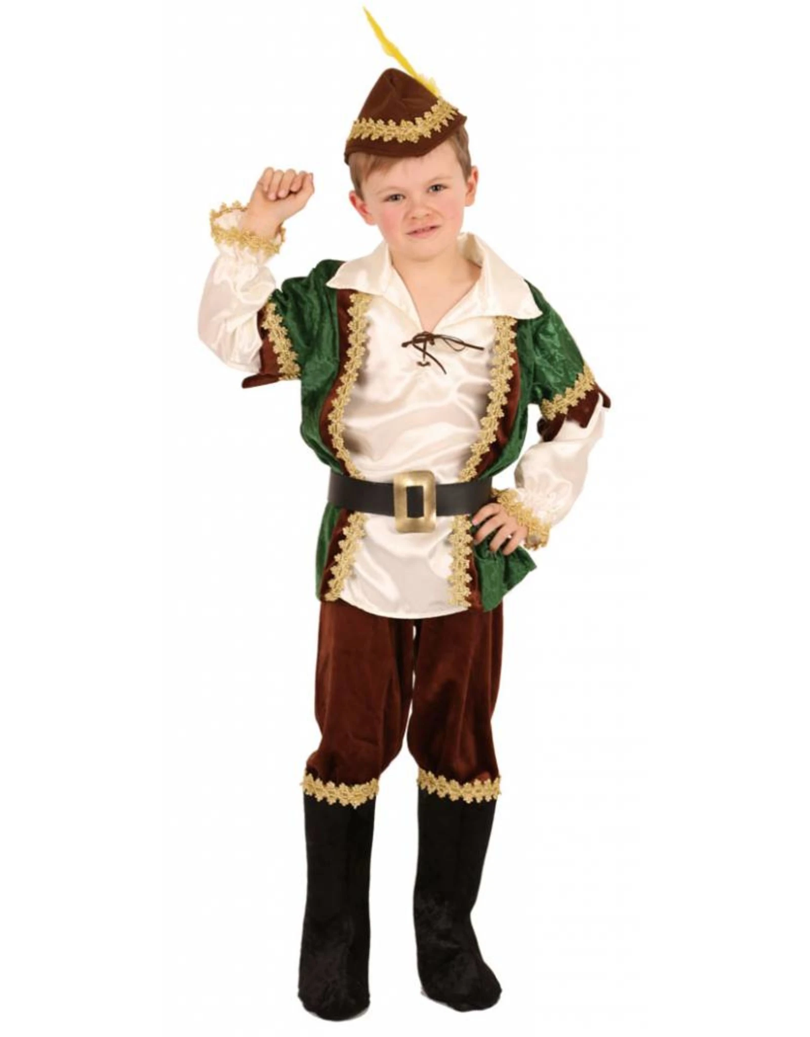 Dit kostuum bestaat uit een witte blouse met groene hes, bruine broek, riem, beenkappen en hoedje.