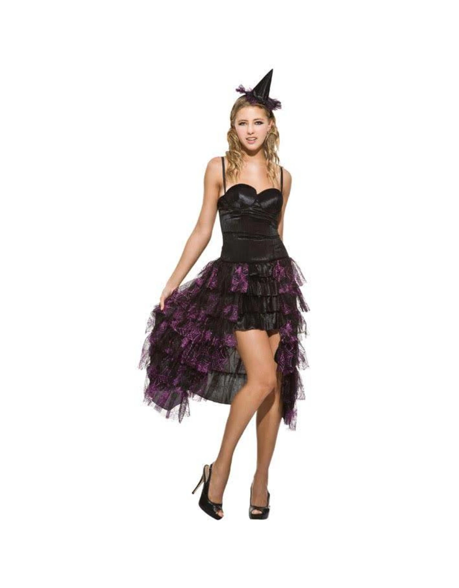Dit kostuum bestaat uit een jurk met verlengde achterkant en hoed.