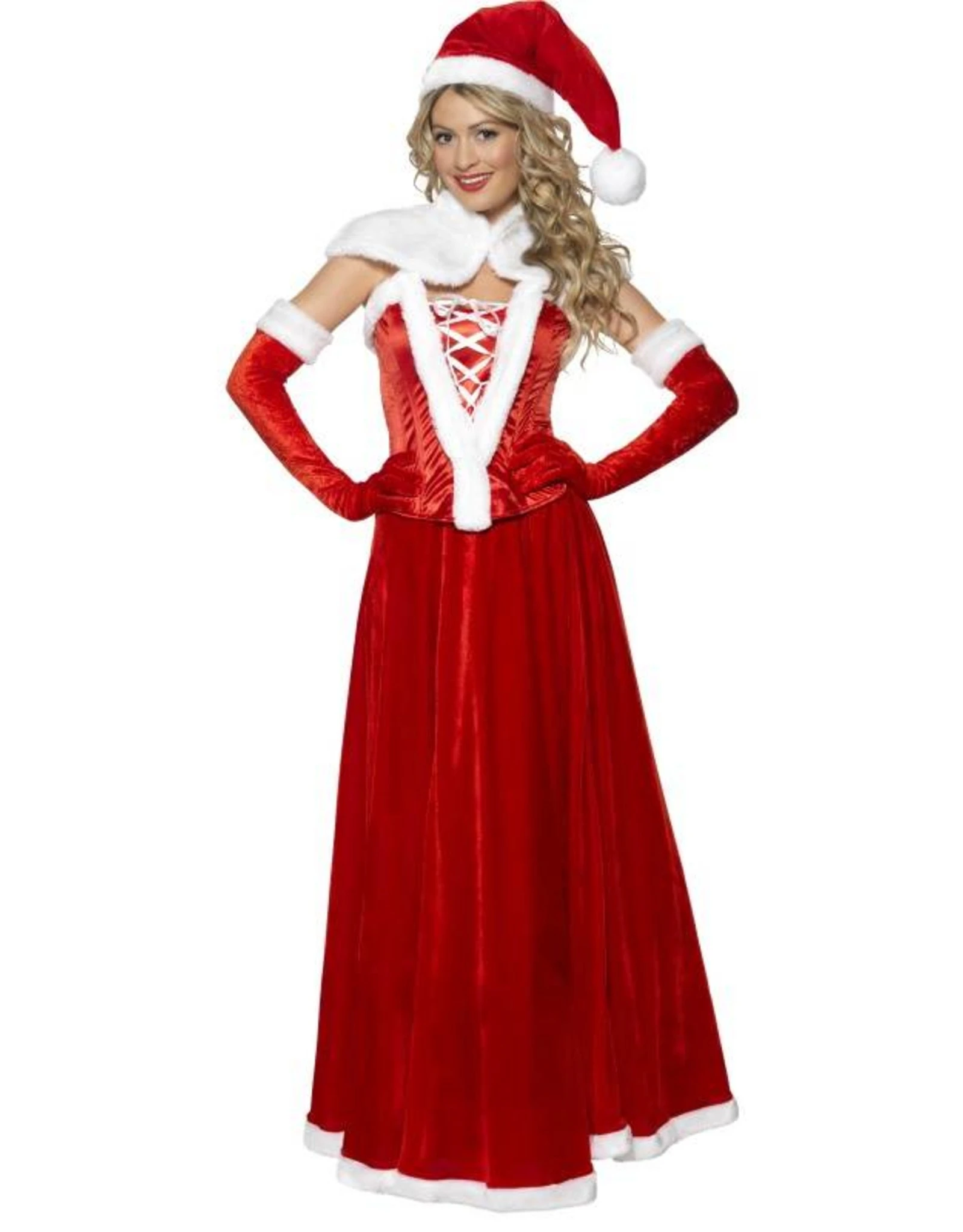 Dit kostuum bestaat uit een corset, lange rok, muts, cape en handschoenen.