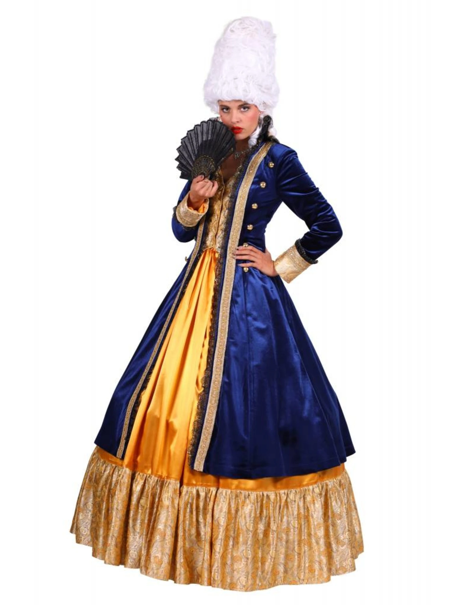 Dit kostuum bestaat uit een jurk, jas en hoepelrok.