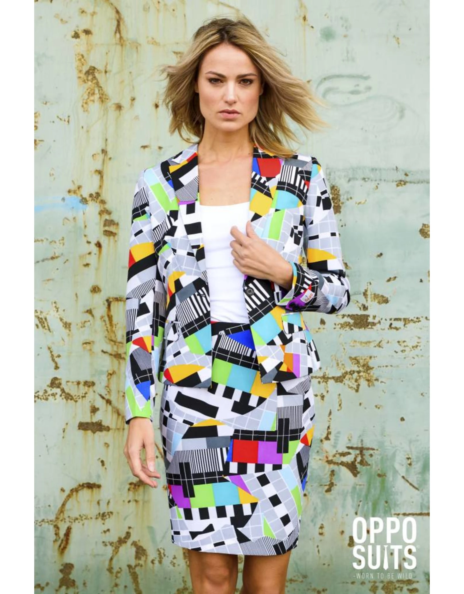 Als retro helemaal je ding is, dan is Ms. Testival helemaal je outift. Dit herkenbare OppoSuits design is gebasseerd op het alom bekende TV testbeeld van vroeger. Dit dames pak is bij uitstek geschikt voor feestjes én festivals, maar we vinden het ook niet erg als je het aan hebt terwijl je gewoon Netflix aan het kijken bent.