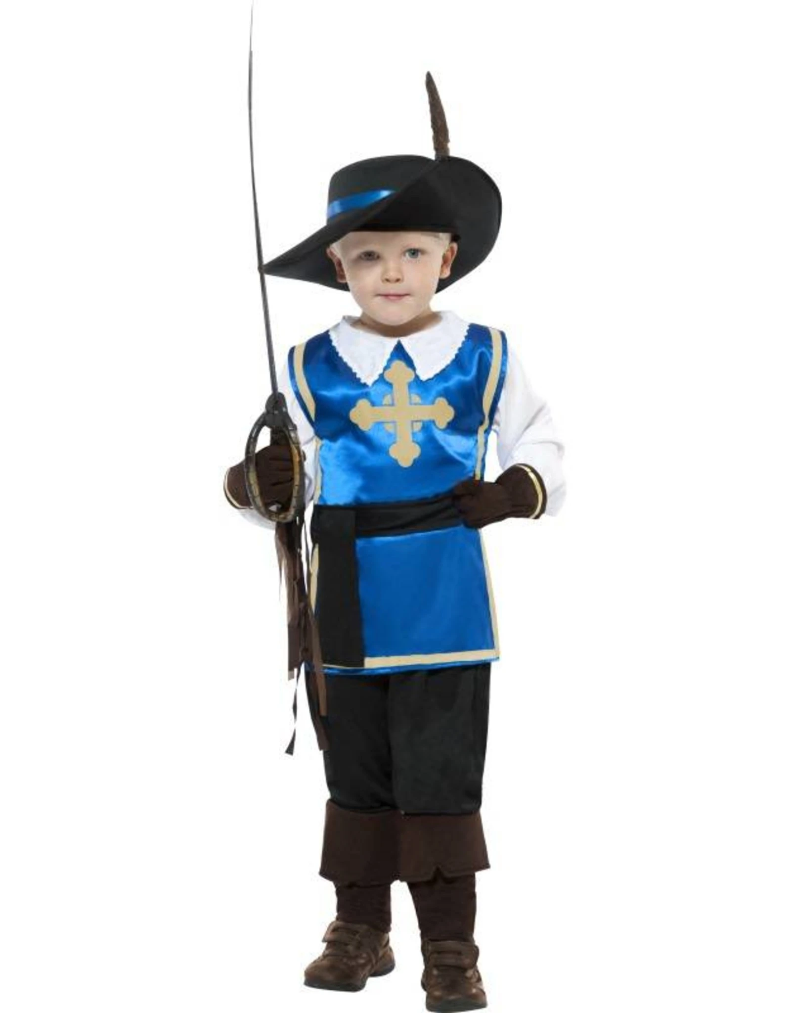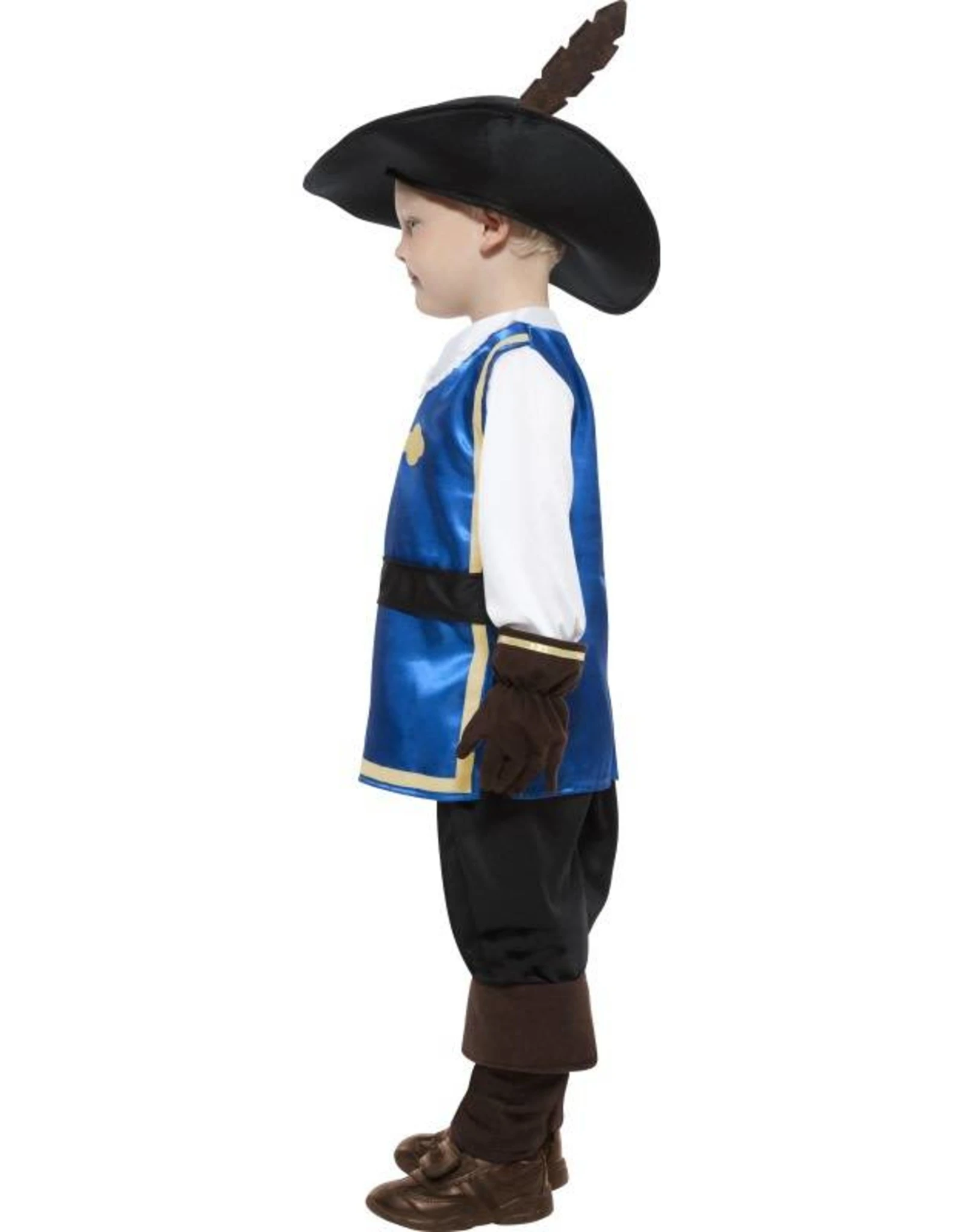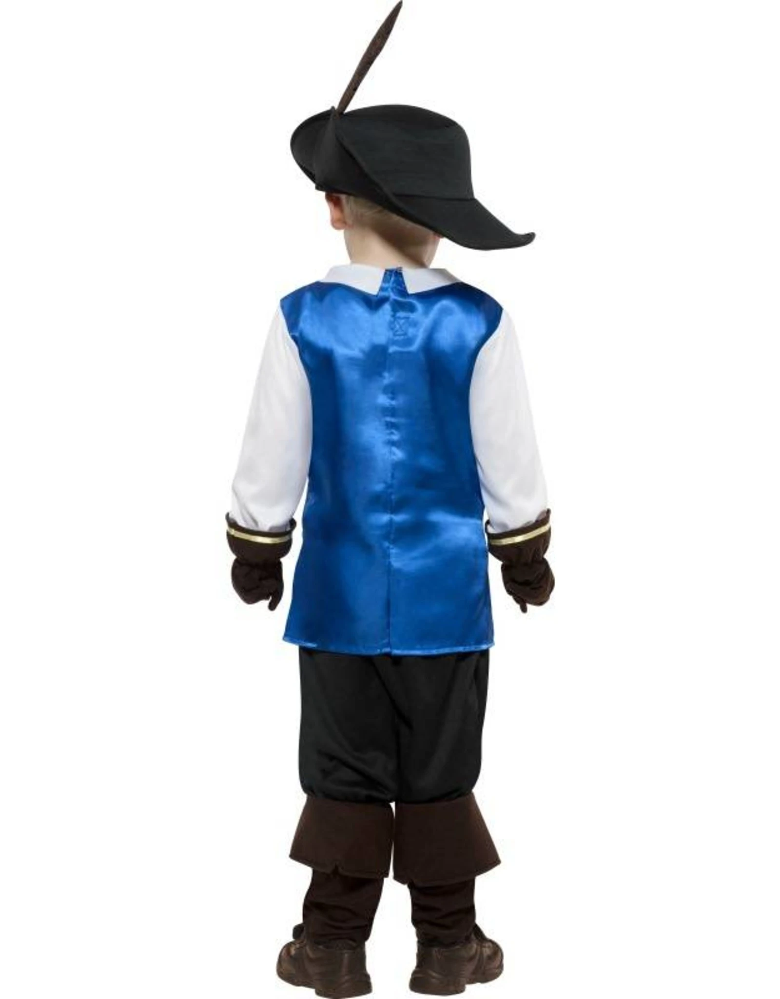 Dit kostuum bestaat uit een shirt, broek, hoed en handschoenen.