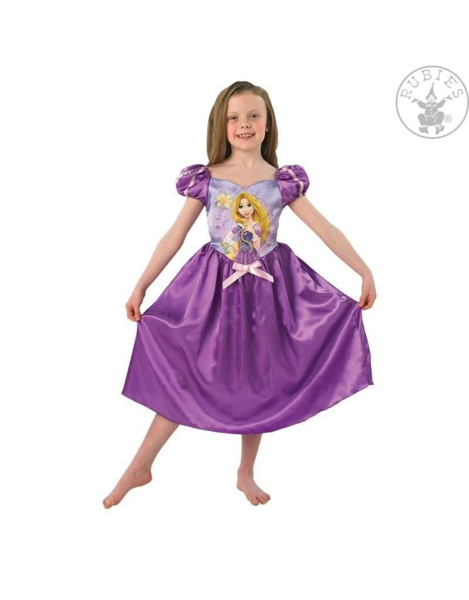 Paarse prinsessenjurk met pofmouwen, roze sierstrik en een grote afbeelding van Rapunzel op het borststuk.