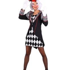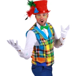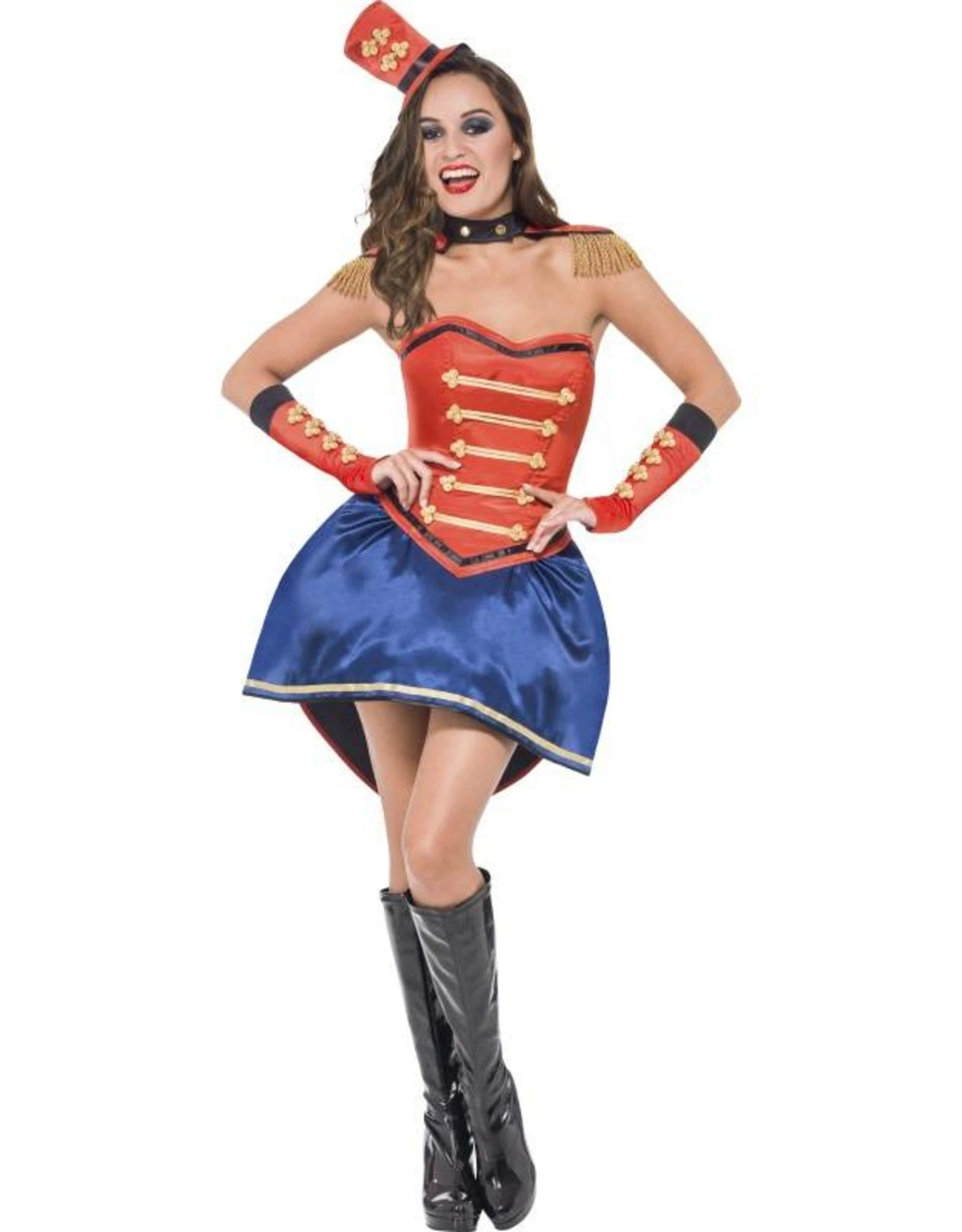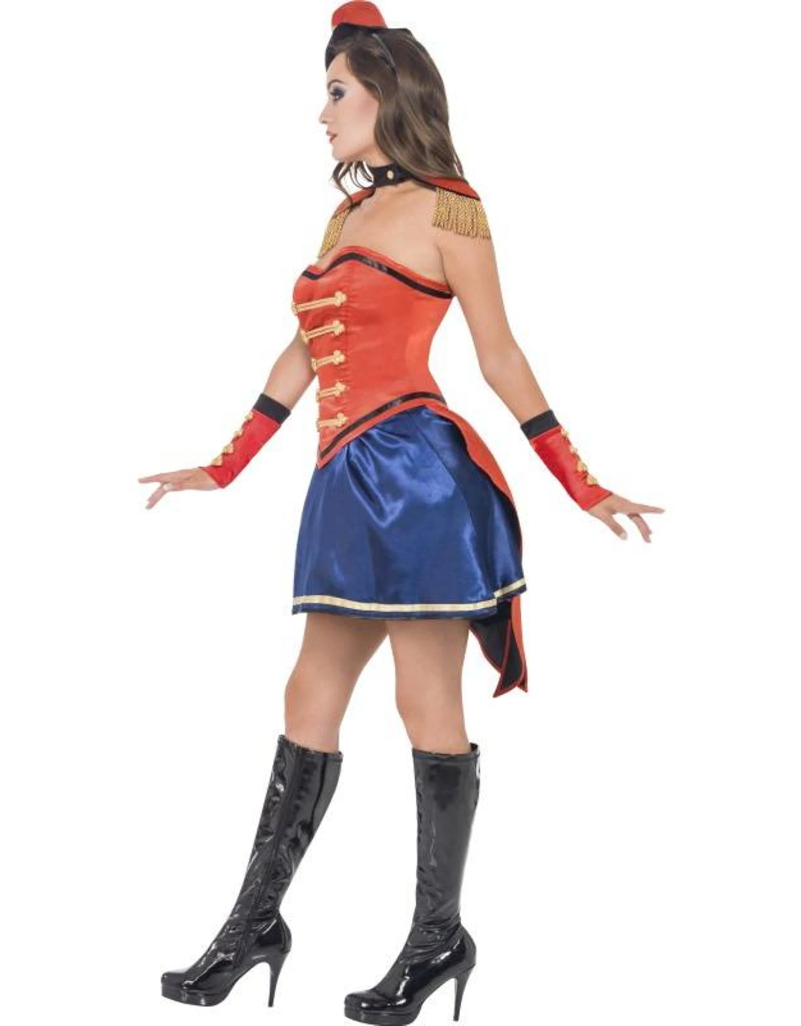 Dit kostuum bestaat uit een rode corset, blauw rokje, nekbandje, hoedje, handschoenen, epauletten